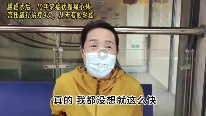 接连两次手术无法治疗自己的终板炎让尤女士很苦恼,最近在朋友的介绍找到了宫氏脑针总部,想彻底治愈自己的疾病。经过宫氏脑针九针的治疗,尤女士兴奋地告诉我们:“我现在基本好了,没有想到这么快。我原来走路不管有人没人都用两手扶着,腰上还围着围腰子,扎完两针后我就把围腰子去掉了,我寻思试一试,现在走路走上40分钟没事,也不用手扶着了,宫氏脑针创造了奇迹”。