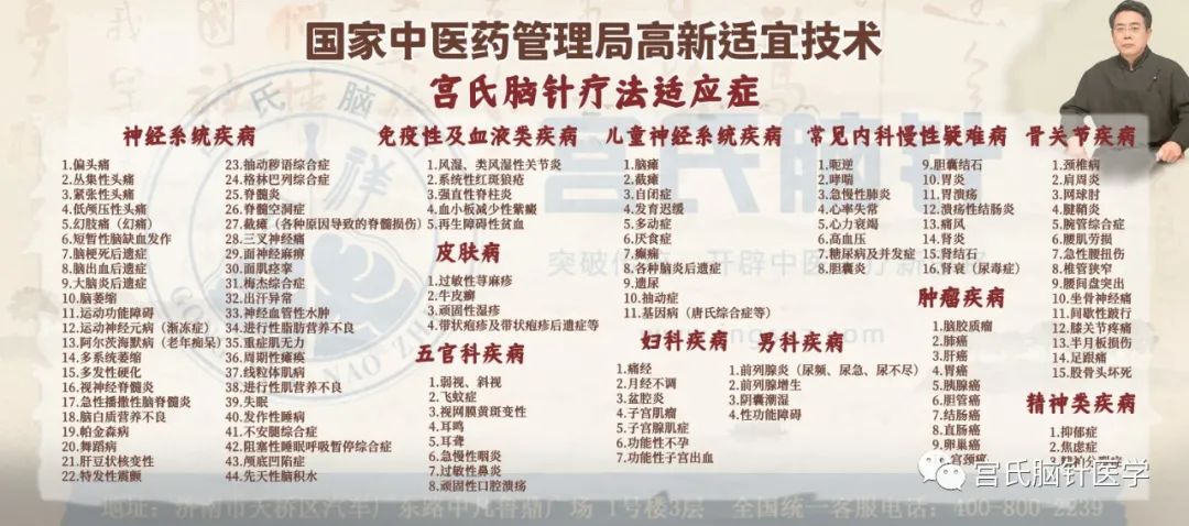 宫氏脑针疗法,2017年2月获国家中医药管理局高新适宜技术认证;2021年2月被山东省卫健委批准为“齐鲁医派中医药特色技术整理推广项目”。自2015年推广以来,脑针疗法已逐渐得到社会的广泛认可,有万余名从医学员遍布全国,每年治疗患者达380万人次,并逐年增长。大量临床实践证明,该疗法尤其对疑难杂症有较明显疗效,某些疾病的治疗达到国内领先及国际先进水平,在业界引起强烈反响,在大众树立了良好的口碑。