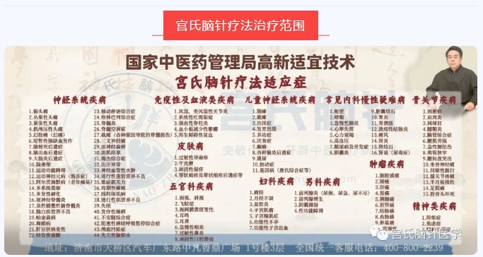 宫氏脑针疗法,2017年2月获国家中医药管理局高新适宜技术认证;2021年2月被山东省卫健委批准为“齐鲁医派中医药特色技术整理推广项目”。自2015年推广以来,脑针疗法已逐渐得到社会的广泛认可,有万余名从医学员遍布全国,每年治疗患者达380万人次,并逐年增长。大量临床实践证明,该疗法尤其对疑难杂症有较明显疗效,某些疾病的治疗达到国内领先及国际先进水平,在业界引起强烈反响,在大众树立了良好的口碑。