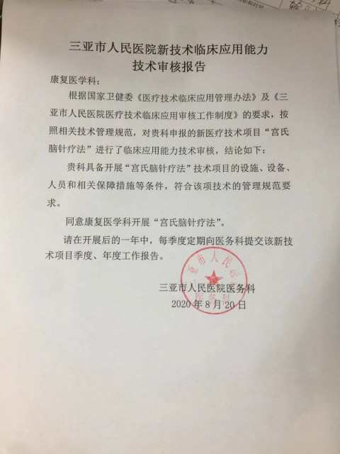 2020年8月20日,三亚市人民医院将宫氏脑针正式列为独立的诊疗项目;